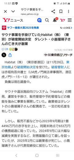 1 : 以下、?ちゃんねるからVIPがお送りします :2025/12/04(木) 00:15:10.814 ID:ro4fu2ub0.netサウナ事業を手掛けていたHabitat(株)(東京)が破産開始決定 タレント・小島瑠璃子さんの亡き夫が創業(東京商工リサーチ) - Yahoo!ニュース : 以下、?ちゃんねるからVIPがお送りします :2025/12/04(木) 00:15:29.198 ID:ro4fu2ub0.netどーしてこーなった転載元スレッド:…