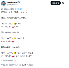 1 :名無しさん@おーぷん:25/12/04(木) 08:26:49 ID:qkea 移民を増やし過ぎたスウェーデン 移民を増やさなかったポーランド 2: 名無しさん@おーぷん:25/12/04(木) 08:27:13 ID:qkea スウェーデン「500万円あげるから帰って」と移民の自主出国促す 北欧の寛容が様変わり 結果こうなったw…