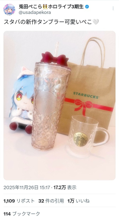 【画像】うさだぺこらさん、陽キャの巣窟スターバックスに行ってしまうwwwwwwwwwwwwwwwwwwwwwwwwスタバの新作タンブラー可愛いぺこ🤍 pic.twitter.com/D43jcQuYJe— 兎田ぺこら👯♀️ホロライブ3期生 (@usadapekora) November 26, 2025 -Vtuberタグ-ホロライブ RSSホロライブ さくらみこ 兎田ぺこら 宝鐘マリン 戌神ころね 星街すいせい 白上フブキ今日のNEW(0゚・∀・)+ ワクテカ +1: 名無しの時事ネタ 2025/11/26(水) 18:46:53.721 ID:ivgxPwti0…