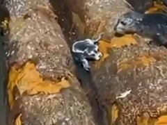 アザラシの赤ちゃんが丸太の隙間で立ち往生していた。ママも心配でそばを離れない → 屈強なおっさんが救出を試みる…