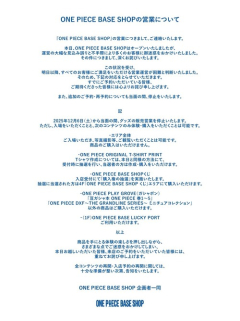 1: 2025/12/06(土) 00:18:35.77 『ONE PIECE BASE SHOP』の営業について#ONEPIECEBASESHOP pic.twitter.com/Ix3Hm8NHQY— 【公式】ONE PIECE BASE SHOP(ワンピースベースショップ) (@OP_base_shop) December 5, 2025 ※関連記事 【衝撃】ワンピースの『ひとつなぎの大秘宝』、とんでもない正体がガチ考察されてしまうwww…