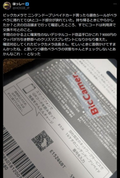 1: 名無し 2025/12/06(土) 21:46:10.41 ID:fP5A35Ow0 どうする任天堂ほっしー@HOSSIE_JPビックカメラで ニンテンドープリペイドカード買ったら銀色シールがペラペラに捲れててQRとコード部分が抉れていた。持ち帰るときにやらかしたか?と次の日店舗まで行って確認したところ、すでにコードは利用済で交換不可とのこと。手間のかかる上に確実性のないデジタルコード窃盗手口かこれ?9000円のクッパが万引き野郎へのクリスマスプレゼントになりかなり萎えた。確認対応してくれたビックカメラ店員さん、忙しいときに面倒かけてすまんかったね、と思いつつ銀色ペラペラの状態ちゃんとチェックしないとあかんなこれ・・となった…