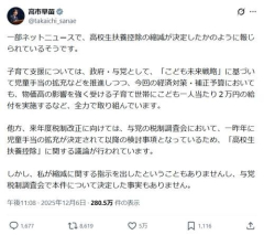 高市首相、深夜のX投稿「一部ネットニュースで報じられているそうです」「(高校生扶養控除の縮減について)決定した事実ない」