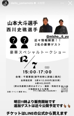 山本大斗インスタグラム この投稿をInstagramで見る プロ野球イベント会社 ミセス(@mises.ibent)がシェアした投稿 プロ野球イベント会社 ミセス 運営の考えだと…1人当たり36秒サイン、写真、トーク現実1人当たり3分200人でも休憩なしで10時間コース日付超える可能性濃厚— しぞーか🍵🗻🍊ゆる鴎会⚾️🍻 (@ocha_yurukamome) December 6, 2025 ダメですね🙅♀️1時間で100人?秒だし、質問コーナー?誰が答えるの?ツッコミどころしかない(´・ω・`)— karin (@karin_3_4) December 6, 2025…