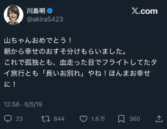 麒麟川島「山里亮太結婚おめでとう!血走った目で行ってたタイ旅行とも長いお別れやね!」←これ