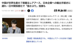 1 : 中国が世界生産の7割握るレアアース、日本企業への輸出手続きに遅れ…日中関係悪化で「揺さぶり」指摘も(読売新聞オンライン) - Yahoo!ニュース 日本企業に対する中国からのレアアース(希土類)の輸出許可手続きが、通常より遅れていることが分かった。台湾有事を日本の「存立危機事態」に認定しうるとした高市首相の国会答弁から7日で1か月となるが、答弁を受けた日中関係の悪化が背景にある可能性がある。日本政府は中国側の出方を見極めている。全文はソースで…