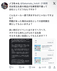 引用元: 1511: Vtuberまとめ (ワッチョイW 928e-LJBo) 2025/12/08(月) 16:24:36.47 ID:1jwkUsnZ グッズの遅延で結構不満噴出してるな 決算で在庫評価減だったし今結構やばそうだな 1525: Vtuberまとめ (ワッチョイ b09d-rKfz) 2025/12/08(月) 16:25:56.17 ID:jZlOI3ce >>1511 そらそう ただでさえ注文から半年遅れなのに 1529: Vtuberまとめ (ワッチョイW da16-G5mv) 2025/12/08(月) 16:26:14.43 ID:zCDHehWL >>1511 あらゆるグッズで起きてるんだなこれ やっぱシステムか工場かは知らんがどこか一部期間の受注分丸々飛んだ? 1538: Vtuberまとめ (ワッチョイW 0e5f-MIMI) 2025/12/08(月) 16:26:56.73 ID:BmVSb6xL >>1511 また別件か 連絡したから発覚してる感じかこれ 1552: Vtuberまとめ (ワッチョイW 59ad-iCRw) 2025/12/08(月) 16:27:54.60 ID:cS3Rsndc >>1529 全然その可能性もあり得るが運営からの説明一切無いのもどうなってんだっつう 1554: Vtuberまとめ (ワッチョイW e67b-FWoe) 2025/12/08(月) 16:28:08.80 ID:IHbIeMwA >>1511 グッズで不具合あったんで問い合わせたけど調査するって返信のあと数ヶ月放置されてるわ いつかオンラインショップは不満爆発するだろうなあと思ってた 1564: Vtuberまとめ (ワッチョイW da16-G5mv) 2025/12/08(月) 16:29:08.36 ID:zCDHehWL >>1552 なんで説明しねえんだろうなとりあえず理由説明すれば納得はせずとも理解はするだろうに そのくせコウゾーは余計な言い訳付け加えるし カバー内の優先順位が謎すぎる 1571: Vtuberまとめ (ワッチョイ b065-o3hk) 2025/12/08(月) 16:30:16.64 ID:x6LQ1h1j >>1564 昨今の日中情勢起因だとしたら中国様のせいにするとまた出禁食らうとか思ってそう 1589: Vtuberまとめ (ワッチョイ 4fcf-rKfz) 2025/12/08(月) 16:31:36.66 ID:rDnNPEj3 >>1564 何も言わずに泣き寝入りしてくれる人が多ければ多いほど助かるからな バカが多ければワンチャン再生産しなくても足りる Amazonと同じ 1603: Vtuberまとめ (ワッチョイ 4beb-Cw38) 2025/12/08(月) 16:32:59.79 ID:QeZoZnLJ >>1564 責任者Xやってるから聞いたらええやん 1610: Vtuberまとめ (ワッチョイ bd35-aDA7) 2025/12/08(月) 16:33:13.06 ID:gcb59jeY >>1564 なんかそれだけ見るととんでもないやばい企業にみえるな…