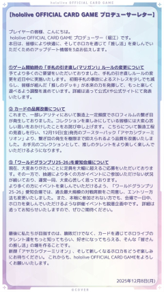 引用元: 1575: Vtuberまとめ (ワッチョイW 1b5b-88W6) 2025/12/08(月) 22:29:30.82 ID:YaLiN7z9 hololive OFFICIAL CARD GAME【公式】 @hololive_OCG (2025/12/08 21:45:00) 【お知らせ】 『hololive OFFICIAL CARD GAME』プロデューサーレターを公開しました。 日頃から応援を続けてくださるみなさまに、今後のアップデート情報を3点お伝えいたします。 これからも『hololive OFFICIAL CARD GAME』をどうぞよろしくお願いいたします。 #ホロカ #ホロライブ #ホロ活 【お知らせ】『hololive OFFICIAL CARD GAME』プロデューサーレターを公開しました。 日頃から応援を続けてくださるみなさまに、今後のアップデート情報を3点お伝えいたします。これからも『hololive OFFICIAL CARD GAME』をどうぞよろしくお願いいたします。#ホロカ #ホロライブ #ホロ活 pic.twitter.com/cEQx2YfUPA — hololive OFFICIAL CARD GAME【公式】 (@hololive_OCG) December 8, 2025 1618: Vtuberまとめ (ワッチョイW e63b-wVzW) 2025/12/08(月) 22:30:29.47 ID:DlAhC7Px >>1575 1は結構ゲーム性変わるな 1629: Vtuberまとめ (ワッチョイW da16-G5mv) 2025/12/08(月) 22:30:40.87 ID:s2V9c1Nz >>1575 なんでホロカ部門だけこんな健常なの? 1640: Vtuberまとめ (ワッチョイ d08e-rKfz) 2025/12/08(月) 22:31:07.22 ID:aWIIRkaO >>1575 マリガンついに変えるのか 1673: Vtuberまとめ (ワッチョイW a05f-EziN) 2025/12/08(月) 22:31:42.66 ID:2yb6UHqH >>1575 品質改善いいね 1685: Vtuberまとめ (ワッチョイW 7c65-saoR) 2025/12/08(月) 22:32:06.53 ID:RmUB7hzY >>1575 コレクションなのに継ぎ目はほんまガイジ 1688: Vtuberまとめ (ワッチョイW 9b8e-h7Pm) 2025/12/08(月) 22:32:19.19 ID:QF5PzpG8 >>1575 こんな根本のルールが変わることあるんだって思ったけど遊戯王とかも先行ドロー無くなるとかフィールドの配置変わるとかあったな 1702: Vtuberまとめ (ワッチョイ dee5-5koE) 2025/12/08(月) 22:32:40.45 ID:dIMH1gkc >>1685 まぁポケモンでもあるからな 1705: Vtuberまとめ (ワッチョイW 7c65-saoR) 2025/12/08(月) 22:32:44.77 ID:RmUB7hzY >>1688 MtGも割とマリガン変わってるし 1711: Vtuberまとめ (ワッチョイW 20ee-2Sze) 2025/12/08(月) 22:33:00.32 ID:F8li3slu >>1688 ペンデュラム召喚とかいう黒歴史 1718: Vtuberまとめ (ワッチョイW da16-G5mv) 2025/12/08(月) 22:33:20.96 ID:s2V9c1Nz >>1575 YAGOOやホロアースもこういうの出さないか? 1743: Vtuberまとめ (ワッチョイ 1f8e-sOJS) 2025/12/08(月) 22:34:01.83 ID:CIi1b1z4 >>1575 ホロカ運営はカードあんましらんど素人にしてはマジで頑張ってるとは思う 1748: Vtuberまとめ (ワッチョイW 9b8e-h7Pm) 2025/12/08(月) 22:34:09.45 ID:QF5PzpG8 >>1705 MtGでもそうなんだ デュエマは新ルールでゾーンが増えるとかあるけど根本のルールまでは変わらないのに 1815: Vtuberまとめ (ワッチョイW 9b8e-h7Pm) 2025/12/08(月) 22:35:28.37 ID:QF5PzpG8 >>1711 数字持ちで挟んだら間のレベル出し放題になるやつだっけ 遊戯王みたいなコストの概念が薄いゲームで無法地帯作ったら高速化して荒れるよな 1836: Vtuberまとめ (ワッチョイW b15f-wFiv) 2025/12/08(月) 22:35:49.98 ID:AgcXN5HB >>1575 ポケカですらやらない品質改善やるとかやるじゃん 1875: Vtuberまとめ (ワッチョイ 1b5b-sOJS) 2025/12/08(月) 22:36:49.88 ID:aHsZ6t5a >>1711 ペンデュラムでついていけなくてリンクで脱落したわ😭 1913: Vtuberまとめ (ワッチョイ 059d-rKfz) 2025/12/08(月) 22:37:52.71 ID:Rds5a3qn >>1575 ホロカ運営は健常なの笑う 1951: Vtuberまとめ (ワッチョイW 20ee-2Sze) 2025/12/08(月) 22:38:18.07 ID:F8li3slu >>1815 しかも専用のカード置けるゾーン追加されて無法地帯と化したんだよな 結局専用ゾーン廃止されて落ち着きを取り戻したけど 2046: Vtuberまとめ (ワッチョイW 20ee-2Sze) 2025/12/08(月) 22:39:22.89 ID:F8li3slu >>1875 おじさんには生贄召喚くらいでちょうどいいよな🙄…