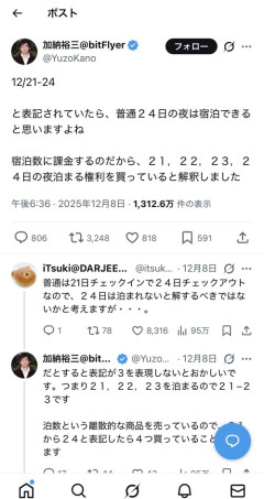 1: 2025/12/09(火) 22:33:48.87 12/21-24と表記されていたら、普通24日の夜は宿泊できると思いますよね宿泊数に課金するのだから、21,22,23,24日の夜泊まる権利を買っていると解釈しました— 加納裕三@bitFlyer (@YuzoKano) December 8, 2025 ※関連記事 【画像】この漫画の「ダメ人間」と付き合っている彼女の話、少し怖くて草wwwww…