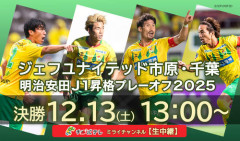 1: ゴアマガラ ★ 2025/12/09(火) 22:23:58.96 ID:X/sFUJLl9 千葉テレビ(チバテレ)は9日、13日にフクダ電子アリーナで行われる、明治安田J1昇格プレーオフ2025決勝・ジェフユナイテッド市原・千葉対徳島ヴォルティス戦を、同日午後1時からミライチャンネル(第2チャンネル)で生中継すると発表した。 ゲスト解説は、08年12月6日のJ1最終節FC東京戦に後半29分からの4発で4-2と逆転勝ちし、J1残留を決めた“フクアリの奇跡”を成し遂げた1人、OBの元日本代表FW巻誠一郎氏(45)が務める。プレーオフ決勝はNHK BSでの生中継が先に発表されていたが、悲願の17年ぶりのJ1復帰にかけるジェフを、地元局として最大限にバックアップする緊急生中継となる。 チバテレは、11月29日にフクダ電子アリーナでジェフがFC今治に5-0と大勝したJ2最終戦を生中継。ジェフは勝ち点を70に積み上げ、初優勝の水戸ホーリーホック、2位で自動昇格したV・ファーレン長崎に勝ち点1及ばず3位となり、プレーオフに回ったが、チバテレは7日に同所で行われたJ1昇格プレーオフ2025準決勝RB大宮アルディージャ戦も生中継。 同戦は前半20、32分と連続失点し、後半3分にも3点目を失う苦しい展開。敗色濃厚かと思われたが、同26分にFWカルリーニョス ジュニオのゴールで反撃ののろしを上げると、同32分にMFエドゥアルド、同38分に、この試合がデビュー戦となった下部組織U-18所属の17歳MF姫野誠、さらに同42分にはDF河野貴志と、16分間で圧巻の4発。“フクアリの奇跡”を再現した、Jリーグの歴史に残る1戦と各スポーツメディアで報じられた。 チバテレにとって、J2最終節、J1昇格プレーオフ2025準決勝に続く、3試合連続の緊急生中継となる。実況は、FC今治戦を担当したチバテレ「モーニングこんぱす」(月~金曜午前6時45分)月・火曜MCのフリーアナウンサー桑原秀和(40)が担当。解説はFC今治戦、大宮戦に続き、ジェフOBでクラブユナイテッドオフィサーを務める、元日本代表MF佐藤勇人氏(43)が3試合連続で務める。 ジェフは今季、徳島には1勝1分けと分が良い。6月15日のアウェー戦で激しい打ち合いの末、3-3で引き分けると、8月16日のホーム戦では一転、オウンゴールで1-0と競り勝っている。今季、4位の徳島も5位のジュビロ磐田との準決勝ではホームで前半24分に先制を許すも、後半37分にFWトニー アンデルソンのゴールで1-1で引き分け、決勝に進んでおり、決勝もギリギリのせめぎ合いが予想される。…
