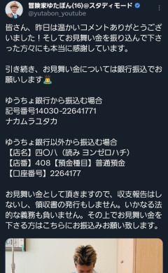 【悲報】ゆたぼん、Xでお見舞い金を乞食