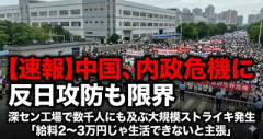 1: 名無し 2025/12/10(水) 13:45:12.89 ID:Kq5mN3zR0 12月4日、中国・深センの電子機器メーカーで約3000人の従業員によるストライキが発生した。 会社側が突然「残業なし」を通知した結果、月収が最低賃金(2520元)を大きく下回る1000元台(約2〜3万円)に激減し、生活苦を訴える労働者が抗議。 工場前では警備員との衝突や警察による連行騒ぎも起き、武装警察が投入される事態に発展している。 ■要約 ・深センの工場で「残業カット」をきっかけに3000人規模のストライキが勃発。 ・手取りが最低賃金の半分以下(1000元台)になり、生存権に関わる事態に。 ・抗議する労働者に対し、当局は武装警察を投入して力で抑え込む構え。 ・「世界の工場」と呼ばれた中国製造業の崩壊と、社会不安の増大が浮き彫りに。 ■解説 月収2万円台でどうやって生きていけと言うのか。これが「共同富裕」を掲げる国の実態だ。 残業代がないと生活できないという歪な賃金構造もさることながら、生存をかけて声を上げた労働者を武装警察で鎮圧しようとする強権的な対応には戦慄を覚える。 中国経済の減速はもはや隠しようがなく、末端の労働者にそのしわ寄せが直撃している。 不動産バブルの崩壊や外資の撤退が招いたこの惨状は、習近平政権の失政そのものと言っていいだろう。 日本企業にとっても、サプライチェーンの混乱や暴動リスクは対岸の火事ではない。 「安い労働力」というかつてのメリットは消え失せ、今やチャイナリスクだけが残っている現実を直視し、脱中国(デカップリング)をさらに加速させるべきだ。 【w】中国、麻生副総裁を猛批判「この日本の政治屋」「日本の軍国主義を復活させようとする意図を露呈!」 【速報】 テレ朝「中国が事前通告のお運勢を公開!やっぱり自衛隊が悪かった!」⇒ AIで作られた偽物wwwwwwwwww 日本「レ-ダ-照射問題」中国「事前通告!(大嘘」小泉進次郎「訓練通告なかった」中国「音声公開!」元統合幕僚長「戦闘機同士ではなく船舶同士のやり取り(論破」→…