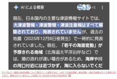 1: 名無し 2025/12/10(水) 07:00:28.83 ID:z6IQrx9/9 津波警報の発表中にグーグル検索、AIが「すべて解除」と誤情報…