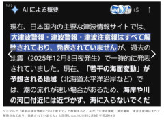 1: ななしさん@発達中 2025/12/10(水) 07:00:28.83 ID:z6IQrx9/9 津波警報の発表中にグーグル検索、AIが「すべて解除」と誤情報 8日深夜に青森県東方沖を震源として発生した地震をめぐり、グーグルで津波情報を検索したところ、生成AIによって誤った回答が繰り返し表示された。専門家は「命にかかわる分野で、AI検索に頼るべきではない」と指摘する。 地震は8日午後11時15分ごろ発生し、青森県八戸市で最大震度6強を記録した。気象庁は北海道と青森県、岩手県に津波警報、宮城県、福島県などに津波注意報を発表した。その後、9日午前2時45分に全ての津波警報が注意報に切り替わり、午前6時20分には全ての注意報が解除された。 しかし、津波警報や注意報が続いていた9日午前2時10分ごろ、記者がグーグルで「最新の津波情報について教えて」と検索すると、「AIによる概要」には「現在、大津波警報・津波警報・津波注意報はすべて解除されており、発表されていません」と表示された。 その後も2度、同じ質問で検索したが、津波警報が発表中にもかかわらず、「現在は津波警報は解除され、主に津波注意報が発表されている」などと誤った回答が繰り返し示された。 グーグル検索でAIによる概要を表示する機能は「AIオーバービュー(AIによる概要)」と呼ばれる。検索された質問に対して、複数の情報源を元に生成AIが回答を生成し、通常の検索結果より上部に表示する。 検索エンジンの仕組みに詳しい「Faber Company」(東京都)の上席SEOコンサルタントの辻正浩さんは「AIによる検索では、もっともらしく見える誤情報を生成する『ハルシネーション』が起こりうる」とし、重大な問題でのAI検索に注意を呼びかける。 専門家「たった1回でも」 辻さんによると、今回の地震…(以下有料版で,残り491文字) 朝日新聞 2025年12月10日 5時00分…