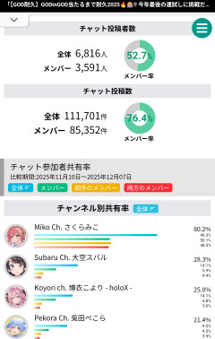 引用元: 784: Vtuberまとめ2025/12/12(金) 01:11:11.97 ぺこらにチャットした人 どんどん減ってます #1 6300人 #2 5300人 #3 4800人 789: Vtuberまとめ2025/12/12(金) 01:11:28.67 >>784 うおw 794: Vtuberまとめ2025/12/12(金) 01:11:35.00 >>784 数字は? 802: Vtuberまとめ2025/12/12(金) 01:11:44.21 >>784 みこは? どうせぺこらより低いだろ? 808: Vtuberまとめ2025/12/12(金) 01:11:55.39 >>784 不思議やね 809: Vtuberまとめ2025/12/12(金) 01:11:57.14 >>784 あれ? 825: Vtuberまとめ2025/12/12(金) 01:12:22.25 >>802 前フリやめろ 828: Vtuberまとめ2025/12/12(金) 01:12:29.63 >>784 なんでやろか 842: Vtuberまとめ2025/12/12(金) 01:12:56.46 >>784 同接は全然変わらないのに…なぜ… 849: Vtuberまとめ2025/12/12(金) 01:13:10.19 >>784 ふぐお!w 851: Vtuberまとめ2025/12/12(金) 01:13:15.37 >>784 初日は数字多いし3日目は2日目より1時間短いから当たり前だと思うけど? みこの今日のチャット投稿者減りすぎだよww 854: Vtuberまとめ2025/12/12(金) 01:13:15.63 >>784 え?今日の数字って前回より高くないっけ? 862: Vtuberまとめ2025/12/12(金) 01:13:29.74 >>802 全然減らない…
