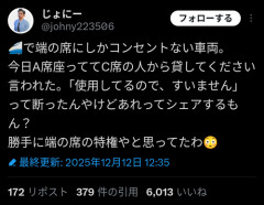 1: 2025/12/13(土) 17:19:05.84 🚄で端の席にしかコンセントない車両。今日A席座っててC席の人から貸してください言われた。「使用してるので、すいません」って断ったんやけどあれってシェアするもん?勝手に端の席の特権やと思ってたわ😳— じょにー (@johny223506) December 12, 2025 ※関連記事 【画像】女さん、新幹線で隣のオッサンがヤバすぎて発狂…
