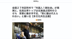 1 : 全国27市区町村で「外国人1割社会」が現実に、住民比率トップは北海道占冠村の36% 背景に働き手不足、「背に腹は代えられない」と雇い主【多文化共生企画】 | NEWSjp 日本に住む外国人が急増している。国の研究機関の推計では、2070年に外国人が総人口の10・8%を占めるようになる見通しだ。こうした中、住民基本台帳のデータから全国の自治体の外国人住民比率を計算したところ、27市区町村では今年1月時点で既に10%を超えていたことが分かった。比率トップは北海道占冠村の36・6%だ。 全国レベルでの1割社会の到来時期は2070年から早まる可能性も出ている。「外国人1割社会」では、いったいどんな生活が待っているのか。未来を先取りした地域を歩いてみた。 ※全文はソースで。↓ 3 : 人自体がいないんじゃなく、 その賃金でその仕事をやりたいと思う人がいない不人気ブラック職なだけ 4 : 出稼ぎ労働者でよくね?…