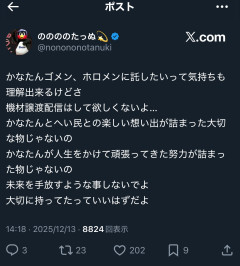 引用元: 14: Vtuberまとめ2025/12/13(土) 17:47:54.77 へいさん、愛が重い 22: Vtuberまとめ2025/12/13(土) 17:48:37.90 >>14 一番濃い奴らだからな 33: Vtuberまとめ2025/12/13(土) 17:49:09.51 >>14 果たしてかなたはへい民と本当に楽しい思い出を作れていたのでしょうか… 53: Vtuberまとめ2025/12/13(土) 17:49:59.64 >>14 機材見たらへいみんの事思い出しちゃうからな 悪い意味で 61: Vtuberまとめ2025/12/13(土) 17:50:22.40 >>14 機材渡すの? 64: Vtuberまとめ2025/12/13(土) 17:50:32.53 >>53 まだ人にあげるっていう方がマシだな 普通はぶっ壊すからw 77: Vtuberまとめ2025/12/13(土) 17:50:55.10 >>14 自分たちをかなたの家族と思い込んでるぐらいだし 80: Vtuberまとめ2025/12/13(土) 17:51:02.48 >>14 機材なんて消耗品だし別にええやろ 114: Vtuberまとめ2025/12/13(土) 17:52:35.71 >>14 先立つものも必要だしメルカリかヤフオクでへい民に向けて売ろうぜ 160: Vtuberまとめ2025/12/13(土) 17:53:53.54 >>14 ヲタが推しを攻撃するタイプだと嫌な思い出しか残らんから機材処分するのも致し方ないと思ってしまう 179: Vtuberまとめ2025/12/13(土) 17:54:24.05 >>14 お前ら捨てたい ってことだよ言わせんな 208: Vtuberまとめ2025/12/13(土) 17:55:16.72 >>14 もうコラボばっかやってる時点でリスナー好きじゃないことに気付こうぜ なんなら前から配信休んだりしてたろ 213: Vtuberまとめ2025/12/13(土) 17:55:27.94 >>14 思い出も全部捨てたいんだな 281: Vtuberまとめ2025/12/13(土) 17:57:25.80 >>14 へい民との思い出が詰まった機材それ呪物だろ🤭 307: Vtuberまとめ2025/12/13(土) 17:58:18.85 >>14 いやただの機械なのに おまえはいやでもかなたが使ってた機械ほしいの1000はいるだろ 汗と手垢しみついたもんだぞ 455: Vtuberまとめ2025/12/13(土) 18:03:14.69 >>61 ホロメンに譲渡するとか何とか…