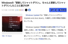 1 : Windows Updateで再起動が必要な更新プログラムを適用した時に、終了時の挙動として「更新して再起動」や「更新してシャットダウン」が選択できる。 このうち「更新してシャットダウン」を選択した場合でも、適用後にシャットダウンしない不具合があった。 12月の月例セキュリティアップデートの際に「更新してシャットダウン」を選択した場合、正常にシャットダウンがかかるようになっている。 これに対して、SNSでは喜びや驚きの声が観測されている。 Windows Updateの言葉を信じて、就寝や外出の前に更新をかけた結果、悲しみを背負ったユーザーも、これで少しは浮かばれるかもしれない。 2 : 神アプデ 3 : あたりまえのことがあたりまえにできる喜びってやつや…