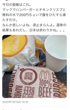 1: 名無し 2022/07/22(金) 11:15:36.53 ID:kzPioGJS0 今日の昼飯はこれ。 マックでハンバーガーとチキンクリスプと無料の水で200円ちょいで腹をひたすら満たすだけ。 なんか悲しいよね、涙止まらんよ。選挙の結果もあれだし、日本は終わりかね。。。 引用元:…