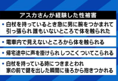 1: ななしさん@発達中 2024/04/13(土) 13:25:03.69 ID:uvAF7pBa9 “白杖”を目印につきまとわれ… 7割が経験 視覚障害につけ込む性被害の実態 デジタル化による弊害も視覚障害者を狙った性被害。ある調査では、68人中48人が被害に遭った経験があると答えている。盲導犬を連れて歩く女性、アスカさん(40代)もその一人だ。「電車に乗ったらいきなりおしり触られるとか」「家の前で急に後ろから抱きつかれて体を触られて…」。 そもそも性被害を受けたことに気づかなかった人もいる。全盲の女性(30代)は「一人暮らしの家の中に小型カメラを仕掛けられたり、外で待ち伏せされてスカートの中を盗撮された」と話す。知らない男に合鍵を作られて部屋に侵入され、カメラを3つ仕掛けられた。半年以上気づかず、母親が部屋を訪ねてきた時に発覚し、その後、男は逮捕された。 相手の目が見えにくいことにつけ込んだ盗撮や痴漢、つきまといなどの性加害行為。視覚障害者はどうやって自分の身を守っていけばいいのか。そして周りができることは何なのか。『ABEMA Prime』で考えた。 ■7割が経験 視覚障害者の性被害の実態 アスカさんは左目が全く見えず、右目もちくわの穴から覗いているほどの視野。外出時は盲導犬や白杖が必須だが、今までに何度も被害に遭ったという。「通勤の帰り、家の前で後ろから抱きつかれた。白杖がかえって目が見えないことの象徴になり、狙われてしまう」。 さらに「善意を装って近づいてきて、物陰に連れて行かれそうになることもあった。予想外のことで、パニックで頭が真っ白になった」と振り返る。 被害に遭った直後、助けを求めて交番に駆け込んだが、警察官に「事情は分かったけれど、あなたも目が見えないんだから外に出ないように気をつけなさいね」と言われたという。「逆に私が怒られてしまって、ショックだった」と明かした。…