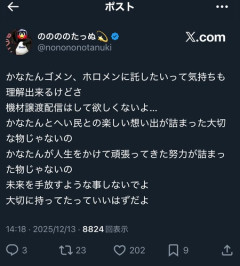 1 名前:名無しさん@おーぷん[] 投稿日:25/12/14(日) 10:01:20 ID:JSun へい民(豚)「…」 2 名前:名無しさん@おーぷん[] 投稿日:25/12/14(日) 10:01:52 ID:qMRr なんとか配信は時々する事にできんか 3 名前:名無しさん@おーぷん[] 投稿日:25/12/14(日) 10:02:01 ID:ZaFy 手放すとしたら過去じゃないの 4 名前:名無しさん@おーぷん[] 投稿日:25/12/14(日) 10:02:20 ID:6Re5 未来なんてないが? 5 名前:名無しさん@おーぷん[] 投稿日:25/12/14(日) 10:03:28 ID:qMRr 天音……