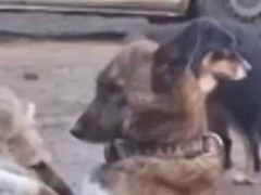 犬の前に並んだ2匹のワンコ。 あなたにも祝福を~♪ ワンコの儀式はこんな感じ……