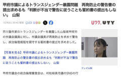 1 : 芥川賞作家のトランスジェンダーを暴露した山梨県甲府市の市議会議員に対し、市議会議長が再発防止を求めて警告し、政治倫理規程を順守する誓約書の提出を求めました。 甲府市議会の政治倫理審査会は、村松裕美市議のSNSの行為は、公人の自覚と責任を欠き、市議会の政治倫理規定に違反すると意見集約しています。 これを踏まえて、市議会の岡政吉議長はきょう9日、村松市議に対し再発防止の警告書を手渡し、政治倫理規程を順守する誓約書の提出を求めました。 これに対し村松市議は、判断が不当であり警告に従うことも誓約書を提出することもしないと述べました。 続きは↓ 甲府市議によるトランスジェンダー暴露問題 再発防止の警告書の提出求めるも「判断が不当で警告に従うことも誓約書の提出もしない」 山梨 5 : アタシ悪くないもんっ! 4 : >>1 この人最下位で当選した元参政党員らしい…