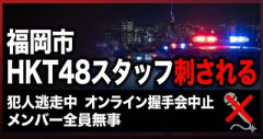 1: 名無し 2025/12/14(日) 19:33:41.56 ID:Jk3s8Lp90 14日に福岡市内で、HKT48関連の男性スタッフが男に刺される事件があった。 関係者によると、男性スタッフが刺されたが、命に別条はないという。犯人は逃走したとみられる。HKT48のメンバーは全員無事に退避したという。 HKT48公式サイトや公式Xによると、この日はオンライン握手会を開催していた。 Xでは「『オンライン握手会』におきまして、諸事情により8部以降(18時~)のオンライン握手会を中止とさせていただきます」と伝えている。 日刊スポーツ ■要約 ・福岡市内でHKT48関連の男性スタッフが男に刺される事件が発生。 ・スタッフは命に別条なし。メンバーは全員無事に退避済み。 ・犯人は現場から逃走しており、現在も確保されていない模様。 ・事件の影響で、同日開催されていたオンライン握手会は中止となった。 ■解説 過去の握手会襲撃事件を彷彿とさせる凶行であり、背筋が凍る思いだ。 今回はスタッフが被害に遭ったとのことだが、身を挺してメンバーや現場を守った可能性もある。 何より恐ろしいのは、犯人が凶器を持ったまま現在も逃走中であるという点だ。 福岡は繁華街も近く、二次被害が起きないか極めて懸念される状況にある。 近年、動機が不明確な通り魔的犯行や、外国人による凶悪犯罪が増加しており、「日本の安全神話」は完全に崩壊したと言っていい。 オンラインイベントの拠点ですら襲撃対象になるとなれば、警備体制の抜本的な見直しが必要になるだろう。 高市政権下で治安対策の強化が進められているが、現場レベルでの警戒感も最大限に高めなければ、国民や若者の命は守れない。 まずは一刻も早い犯人の確保と、動機の解明を望む。 高市早苗「新規メガソーラー規制」高市政権「支援廃止!」日本「電力買取の支援制度から除外!」中国「あっ!(致命傷」中国太陽光発電「遠隔操作で停電... 経営者「1+1は?と聞かれて2と答える奴は落としてる」→理由ww 【動画】 ジャンケンで勝ったら「キットカット」を1つ貰えますwww!!…