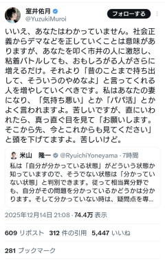 転載元: それでも動く名無し 2025/12/14(日) 23:32:47.78 ID:on7Gsb+v0 こわい ※いいえ、あなたはわかっていません。社会正義からデマなどを正していくことは意味がありますが、あなたを叩く市井の人に激怒し、粘着バトルしても、おもしろがる人がさらに増えるだけ。それより「昔のことまで持ち出して、そういうのやめなよ」と言ってくれる人を増やしていくべきです。私はあなたの妻… — 室井佑月 (@YuzukiMuroi) December 14, 2025 2: それでも動く名無し 2025/12/14(日) 23:33:14.10 ID:sEgJvO/Bd もう誰にでもレスバ仕掛けるバーサーカーみたいになっとるわ 3: それでも動く名無し 2025/12/14(日) 23:33:41.81 ID:El6oblrr0 終末感あるか…