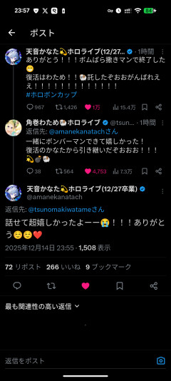引用元: 1606: Vtuberまとめ (ワッチョイW d58f-FTi6) 2025/12/14(日) 23:56:36.02 ID:Y39nHPbR 天音かなた💫ホロライブ(12/27卒業) @amanekanatach (2025/12/14 23:55:15) @tsunomakiwatame 話せて超嬉しかったよーー😭!!!ありがとう☺?☺?❤? 話せて超嬉しかったよーー😭!!!ありがとう☺️☺️❤️ — 天音かなた💫ホロライブ(12/27卒業) (@amanekanatach) December 14, 2025 1615: Vtuberまとめ (ワッチョイW 0465-0SXX) 2025/12/14(日) 23:56:53.84 ID:skqfQxE5 >>1606 言えたじゃねぇか 1616: Vtuberまとめ (ワッチョイ f422-rKfz) 2025/12/14(日) 23:56:55.83 ID:xMpBdKAK >>1606 ホロライブの歴史が変わった 1618: Vtuberまとめ (ワッチョイ 3ec1-o3hk) 2025/12/14(日) 23:56:58.42 ID:MSeTuz4a >>1606 あ、あああ、あ 1627: Vtuberまとめ (ワッチョイ 8312-CtjO) 2025/12/14(日) 23:57:07.96 ID:9K2CGE9O >>1606 おああああああああああああああああ 1628: Vtuberまとめ (ワッチョイW 20ee-2Sze) 2025/12/14(日) 23:57:08.64 ID:xNUmijty >>1606 かなわたは永遠です😭 1629: Vtuberまとめ (ワッチョイW 83b2-7tSk) 2025/12/14(日) 23:57:09.48 ID:bDmgwVOM >>1606 過剰供給 1630: Vtuberまとめ (ワッチョイW dee5-flUO) 2025/12/14(日) 23:57:10.43 ID:jw3NoGaG >>1606 こんなんでいいのか 1633: Vtuberまとめ (ワッチョイ 3ec1-o3hk) 2025/12/14(日) 23:57:14.03 ID:MSeTuz4a >>1606 聞けて良かった 1634: Vtuberまとめ (ワッチョイW 6c8e-F6TI) 2025/12/14(日) 23:57:15.11 ID:1KsMoBFq >>1606 歴史的和解 1635: Vtuberまとめ (ワッチョイW b09d-LJBo) 2025/12/14(日) 23:57:16.26 ID:ixga3red >>1606 かなわたあります 1636: Vtuberまとめ (ワッチョイ 6350-Q1QT) 2025/12/14(日) 23:57:20.49 ID:v4VstzDw >>1606 どらゃああああああああああああああ 1639: Vtuberまとめ (ワッチョイ da04-53VN) 2025/12/14(日) 23:57:23.43 ID:Q3V0l31p >>1606 なんかリスケしてでも4期生コラボせいや 1641: Vtuberまとめ (ワッチョイ 4be5-o3hk) 2025/12/14(日) 23:57:27.41 ID:enea4Wq9 >>1606 うおおおおおおお 1642: Vtuberまとめ (ワッチョイW 84a0-JIzQ) 2025/12/14(日) 23:57:28.59 ID:m0T7V2CP >>1606 最後のかなわた😭 1645: Vtuberまとめ (ワッチョイW 289d-1fg3) 2025/12/14(日) 23:57:31.85 ID:jKbxDs0i >>1606 歴史資料 1647: Vtuberまとめ (ワッチョイW e622-IUBI) 2025/12/14(日) 23:57:34.67 ID:6Uta77Iy >>1606 うおおおおおお 1648: Vtuberまとめ (ワッチョイW 1b8e-2dvg) 2025/12/14(日) 23:57:34.74 ID:NToXgBfG >>1606 今まで話せてなかったってこと? 1649: Vtuberまとめ (ワッチョイW 59f9-wFiv) 2025/12/14(日) 23:57:35.53 ID:ZZml9tl2 >>1606 完璧な雪解け 1650: Vtuberまとめ (ワッチョイW 1b5b-oIsk) 2025/12/14(日) 23:57:35.70 ID:Sqb0yA6t >>1606 よし!かなわたは不人気じゃないな! 1651: Vtuberまとめ (ワッチョイW 7c65-saoR) 2025/12/14(日) 23:57:36.18 ID:NPClj0Ns >>1606 か、返した!? 1657: Vtuberまとめ (ワッチョイW 1b5b-LJBo) 2025/12/14(日) 23:57:44.50 ID:Mgup9ZR1 >>1606 言えたじゃねえか 1659: Vtuberまとめ (ワッチョイW b1f9-F6TI) 2025/12/14(日) 23:57:45.03 ID:7ufMFH81 >>1606 かなわたガイガイここに終結 1661: Vtuberまとめ (ワッチョイW 4be5-uoBr) 2025/12/14(日) 23:57:51.92 ID:pLsmoOns >>1606 おお… 1664: Vtuberまとめ (ワッチョイ 8312-CtjO) 2025/12/14(日) 23:57:53.36 ID:9K2CGE9O >>1606 これ大会中だけのことかな それともその後ディスコで喋ったんかな 1668: Vtuberまとめ (ワッチョイW 83f9-tTgk) 2025/12/14(日) 23:57:56.37 ID:VlXBmRlB >>1606 あれくらいで嬉しかったらタイマンコラボやってやめるのやめろ言われたらかなたそ残留するな 1670: Vtuberまとめ (ワッチョイ 4be5-rKfz) 2025/12/14(日) 23:57:57.41 ID:hfAfVTuK >>1606 ☺ 1671: Vtuberまとめ (ワッチョイ 7c65-rKfz) 2025/12/14(日) 23:57:59.05 ID:qnjQAfZn >>1606 俺、泣いてます 1674: Vtuberまとめ (ワッチョイW e675-flUO) 2025/12/14(日) 23:58:03.59 ID:XfSNjtxZ >>1606 何でせっかくの和解が卒業前なんだよ やっぱ卒業やめろよ😭…