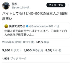 【悲報】アルバイター「中国人より40~50代の日本人が1番態度悪い」
