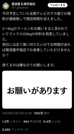 【悲報】ラーメン店「助けて!テレビ局にデカ盛りロケドタキャンされて具材が8kg余ってるの!」