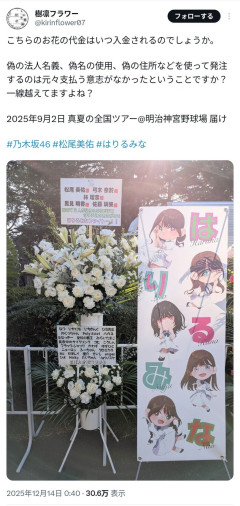 【闇深】乃木坂46オタクさん、ファンから集めたお金を持ち逃げ、花屋が大損害・・・