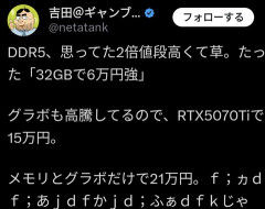 1:それでも動く名無し 2025/12/15(月) 07:54:44.71 ID:OA/rS60Cr ええんか? DDR5、思ってた2倍値段高くて草。たった「32GBで6万円強」グラボも高騰してるので、RTX5070Tiで15万円。メモリとグラボだけで21万円。f;ヵdf;あjdfかjd;ふぁdfkじゃ自作界隈、完全オワコン pic.twitter.com/vbVydWuXeQ— 吉田@ギャンブラー (@netatank) December 13, 2025…