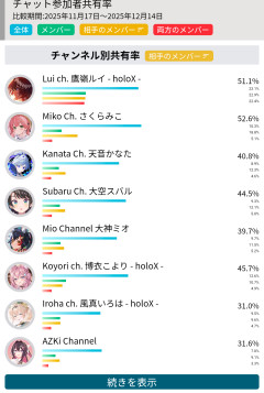 引用元: 444: Vtuberまとめ2025/12/15(月) 18:50:10.55 鷹嶺ルイの復帰配信を見てた 箱愛溢れる光のリスナー 1位 35P 2位 へい民 3位 スバ友 4位 ミオファ 5位 助手 6位 かざま隊 7位 開拓者 458: Vtuberまとめ2025/12/15(月) 18:50:37.96 >>444 ほー 466: Vtuberまとめ2025/12/15(月) 18:50:46.07 >>444 休止してたっけ 472: Vtuberまとめ2025/12/15(月) 18:50:56.14 >>444 光やね 493: Vtuberまとめ2025/12/15(月) 18:51:29.47 >>444 ラプ友さあ・・・ 522: Vtuberまとめ2025/12/15(月) 18:52:18.38 >>444 わためいとはまだ寝てるから仕方ない 524: Vtuberまとめ2025/12/15(月) 18:52:20.48 >>444 チャンネル共有率 ルイよりみこの方が多いってどういうこと? いまいち見方わからん 528: Vtuberまとめ2025/12/15(月) 18:52:31.78 >>493 そもそも少なさそうだししゃーない 562: Vtuberまとめ2025/12/15(月) 18:53:40.92 >>444 派閥でもないのにルイを見てやるのは光でもええわ 572: Vtuberまとめ2025/12/15(月) 18:53:47.38 >>444 野うさぎ… 583: Vtuberまとめ2025/12/15(月) 18:54:03.53 >>572 あ 608: Vtuberまとめ2025/12/15(月) 18:54:46.84 >>572 ちょっと静かにして 612: Vtuberまとめ2025/12/15(月) 18:54:54.73 >>524 計測が直近1カ月だからあまり配信してないとサンプル少なくなるからその現象が起きる事がある 614: Vtuberまとめ2025/12/15(月) 18:54:55.35 >>444 野うさぎほんとにぺこらとその忠実な子分以外興味ないよな…