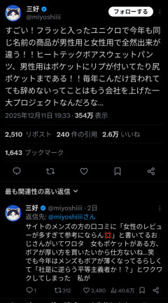 【炎上】女さん、ユニクロにブチ切れ「ユニクロはメンズだけ高品質低価格なのいい加減にしろよ!!!」
