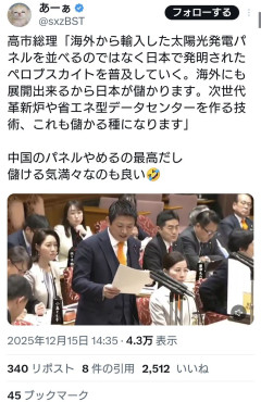 高市総理「海外から輸入した太陽光発電パネルを並べるのではなく、ペロブスカイトを普及していく」