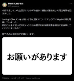 1: 名無し 2025/12/15(月) 15:36:49.15 ID:F+qQ9+zg9 「全国テレビのデカ盛りの撮影が連絡無しで…」ラーメン店が悲痛の食材ロス危機を訴える - 日刊スポーツ 銀波露 札幌手稲店@T_ginparou今日予定していた全国テレビのデカ盛りの撮影が連絡無しで閉店時間を迎えました。2〜8kgのラーメンをお願いすると言われていてマックスの8kgの材料を用意していました。明日には全て使い切りたいのでお時間があれば銀波露手稲店でお食事していただけませんか?捨てるのは嫌なのでお願いします。…