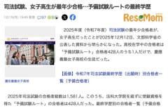1 : 2025年度(令和7年度)司法試験の最年少合格者が、女子高生だったことが2025年12月12日、文部科学省の公表した資料から明らかになった。高校在学中の合格者は「予備試験ルート」合格者428人のうち1人だけで、慶應義塾女子高校の生徒だった。 2025年司法試験の合格者総数は1,581人。このうち、法科大学院を経ずに受験資格を得た「予備試験ルート」の合格者は428人だった。最終学歴別の合格者一覧(予備合格者)によると、合格者428人のうち、最終学歴が「高校在学中」は1人、「高校卒業」は3人、「大学中退」は5人、「大学1年」は2人、「大学2年」は2人、「大学3年」は16人、「大学4年」は51人、「大学卒業」は162人などであった。 最年少合格となる「高校在学中」の合格者1人は、慶應義塾女子高校の生徒。また、最終学歴が「高校卒業」の合格者3人は、それぞれ幸福の科学学園関西高校と青森北高校、福井県立若狭高校の出身。「大学1年」2人は早稲田大学と立教大学、「大学2年」2人はいずれも東京大学の学生であることが明らかになった。 6 : >>1 JKでも合格するのに40過ぎても不合格なヤツwなんなん?wwww 7 : そんなルートがあるんだ…