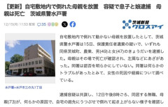 1 : 自宅敷地内で倒れた母を放置 容疑で息子と娘逮捕 母は死亡 茨城県警水戸署 自宅敷地内で倒れて動かない母親を放置したとして、茨城県警水戸署は15日、保護責任者遺棄の疑いで、いずれも同県茨城町、農業、男(49)と女(47)のきょうだいを逮捕した。母親は死亡が確認された。同署は認否を明らかにしていない。同署は女性の死因や経緯について調べている。 2人の逮捕容疑は共謀し、12日午後8時ごろ、同居する無職、母親(73)が、何らかの原因で、自宅の庭先にうつぶせで倒れて起き上がらない様子を確認したものの、同14日午後5時ごろまで放置した疑い。全文はソースで 3 : 邪魔だったんだろうな 4 : 正直すぎるだろ…