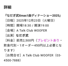 1 名前:muffin ★[] 投稿日:2025/12/15(月) 18:46:23.54 ID:uFMwSGoi9 お笑い芸人のなだぎ武が15日、自身のXを更新。12月23日に開催予定のイベントチケットの売れ行きについて、切実な状況を明かした。 なだぎは投稿で、「皆様、12月23日のイベントが近づいてるんですが、現場チケットが10枚しか売れておりません、、」と報告。続けて、「20枚いかないともうこの会場では2度と出来ないそうなので」と危機的な状況を伝え、「一つ皆様、23日の夜空いてるよと言う方、遊びに来て頂けたら幸いです」と来場を呼びかけた。 イベントは12月23日に開催される「なだぎ武Xmas1曲ディナーショー2025」。会場のキャパシティは60名で、前売券は2500円となっている。 12/15(月) 18:00 15 名前:名無しさん@恐縮です[sage] 投稿日:2025/12/15(月) 18:51:43.43 ID:Robt9mTq0 10枚www 27 名前:名無しさん@恐縮です[sage] 投稿日:2025/12/15(月) 18:54:01.14 ID:4v/XYP9P0 10枚も売れてんのか 26 名前:名無しさん@恐縮です[sage] 投稿日:2025/12/15(月) 18:53:28.36 ID:D+V2h98D0 泰葉はDVD7枚しか売れてないと言うてたな 4 名前:名無しさん@恐縮です[sage] 投稿日:2025/12/15(月) 18:48:30.88 ID:1+tVYCIk0 開会式マン 34 名前:名無しさん@恐縮です[] 投稿日:2025/12/15(月) 18:56:55.48 ID:1+TnJnoE0 開会式マンw……一生言われ続けるだろうな 7 名前:名無しさん@恐縮です[] 投稿日:2025/12/15(月) 18:48:47.55 ID:tQCCUldb0 >>1 ttps://i.imgur.com/nEa3yf6.jpeg 20 名前:名無しさん@恐縮です[] 投稿日:2025/12/15(月) 18:52:22.46 ID:poH9IS+c0 >>7 ファーーーーw 178 名前:名無しさん@恐縮です[] 投稿日:2025/12/15(月) 19:51:26.83 ID:fxNPaSjW0 >>7 思い出しただけでも腹が立つ 117 名前:名無しさん@恐縮です[sage] 投稿日:2025/12/15(月) 19:26:23.35 ID:0q2ME/qt0 >>7 日本を超える開会式はもう無いだろうな フランスは別の意味で超えて来たけど 55 名前:名無しさん@恐縮です[sage] 投稿日:2025/12/15(月) 19:02:14.40 ID:tROhskiC0 この人のことオリンピックで嫌になっちゃった 76 名前:名無しさん@恐縮です[] 投稿日:2025/12/15(月) 19:10:38.07 ID:+3vxZGXb0 何やってる人なのこの人? オリンピックで全世界に恥を晒した以外全く知らん 72 名前:名無しさん@恐縮です[sage] 投稿日:2025/12/15(月) 19:09:26.33 ID:U/S8IUxb0 10人しか客呼べない芸人がオリンピック開会式に…?妙だな… 66 名前:名無しさん@恐縮です[] 投稿日:2025/12/15(月) 19:06:59.62 ID:3zNd41qM0 これだけ人気なくて誰も知らん奴が、オリンピックのショーを担当。 凄すぎる政治力を持ってるわ 33 名前:名無しさん@恐縮です[sage] 投稿日:2025/12/15(月) 18:56:49.92 ID:ebDfAYaL0 2500円で六十席埋められないって引退しますって宣言の方が正しいアナウンスだろ。 9 名前:名無しさん@恐縮です[] 投稿日:2025/12/15(月) 18:49:18.66 ID:r6c4QqDz0 2500円払ってクリスマスになだぎ武見に行くとか前世どれだけの大罪犯したんだよ 10 名前:名無しさん@恐縮です[sage] 投稿日:2025/12/15(月) 18:49:19.18 ID:vEmGRkWM0 クリスマスになだぎを見たいかと言うのがな 164 名前:名無しさん@恐縮です[] 投稿日:2025/12/15(月) 19:45:08.75 ID:DGel04SH0 >>10 ディナーがつくのであればかなりお得かと。 74 名前:名無しさん@恐縮です[sage] 投稿日:2025/12/15(月) 19:10:27.59 ID:M/9O80ep0 前売り2500円ならたぶん食事ついてないと思うけど それディナーショーじゃないのでは ディナーショー風のパロディなのかな 152 名前:名無しさん@恐縮です[sage] 投稿日:2025/12/15(月) 19:41:38.22 ID:3D/4DndG0 そりゃ東京だしw 飲み食い別料金なら無理やわww 157 名前:名無しさん@恐縮です[] 投稿日:2025/12/15(月) 19:43:17.99 ID:alR6R5ZM0 >>152 ライブハウスなんてワンドリンク600円だぞ すげー良心的じゃん 163 名前:名無しさん@恐縮です[sage] 投稿日:2025/12/15(月) 19:44:26.45 ID:3D/4DndG0 >>157 ディナーに飲み物だけかよ…w 57 名前:名無しさん@恐縮です[] 投稿日:2025/12/15(月) 19:04:05.48 ID:qxTah3Eh0 あら、飲食代別って酷いなw 185 名前:名無しさん@恐縮です[] 投稿日:2025/12/15(月) 19:53:53.53 ID:wCRWe/Dl0 ディナーショーじゃないのに 何でディナーってつけたんだろ ギャグにしても悪い方にしか作用してない 48 名前:名無しさん@恐縮です[] 投稿日:2025/12/15(月) 19:00:12.32 ID:/L3i+YYq0 プロが素人に頼むなよ 83 名前:名無しさん@恐縮です[] 投稿日:2025/12/15(月) 19:14:42.88 ID:bAox9YOO0 次のオリンピックまでなんとか頑張れ! ぼっち・ざ・ろっく! 8巻 (まんがタイムKRコミックス)posted with AmaQuick at 2025.12.15はまじあき(著)芳文社 (2025-11-27T00:00:00.000Z)¥842Amazon.co.jpで詳細を見る 葬送のフリーレン(15) (少年サンデーコミックス)posted with AmaQuick at 2025.12.15山田鐘人(著), アベツカサ(著)小学館 (2025-12-18T00:00:00.000Z)¥583Amazon.co.jpで詳細を見る…