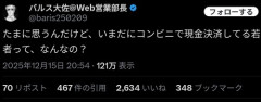 1: 2025/12/16(火) 13:56:18.39 何か特別な理由があるのか? たまに思うんだけど、いまだにコンビニで現金決済してる若者って、なんなの?— バルス大佐@Web営業部長 (@baris250209) December 15, 2025 ※関連記事 【画像】ネット民「マックで勉強してたら席ガラガラなのに横に変なおっさん来て現金2000万見せられたわ…」…
