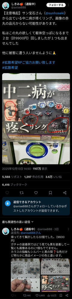 1: 2025/12/16(火) 23:12:49.03 この度は、「中二病が疼くリング」に関しまして、全種コレクトできないという点で、多くの方をご不快にさせてしまいましたことを、深くお詫び申し上げます。 お問い合わせいただきました件につきまして、弊社にて事実確認を行いましたので、以下の通りご回答申し上げます。 「黒いリングが入っていないのではないか」というご指摘につきまして、当該商品はガチャのカプセル内に実在しております。しかしながら、弊社の商品ディスプレイのデザインや表現がお客様の誤解を招いてしまいました。弊社の配慮不足が招いた事態として、真摯に受け止め深く謝罪申し上げます。誠に申し訳ございません 以下はディスプレイに関する詳細となります。まず「全8種」につきまして、中央の8種の商品画像に写っている物が「全8種」の内容となります。しかしながら、弊社が中央の商品画像の他に、色味が異なるように見える商品画像を掲載してまったことや「漆黒」という誇大表現を用いたことで、お客様の誤解を招くこととなってしまいました。 お客様が、アタリと認識された当該商品は「アンティークメッキ」という加工を施しており、メッキのかかり方によっては「黒」というよりも「シルバー」に近い色味に見えるものが生じます。中央の写真では、シルバーカラーに近い色味の写真が掲載されておりますが、周辺に掲載した写真では「完全な黒」であるかのような強調した表現を用いており、実物と画像の印象が著しく異なることにより、「当たりが入っていない」と感じさせてしまいました。 お客様の誤解を招くような表現の商品を販売してしまい、誠に申し訳ございません。 今後は、実物の色味や質感を正確にお伝えできるディスプレイ・画像表現を徹底することを固くお約束いたします。 頂戴しました厳しいお言葉を真摯に受け止め、二度とこのようなご迷惑をおかけすることのないよう、全社を挙げて改善に努めてまいる所存です。 甚だ勝手なお願いとは存じますが、今後とも忌憚のないご意見を賜り、私どもの成長にお力添えをいただければ幸いに存じます。 サン宝石事業部一同 ※関連記事 【画像】オタク「この絵師、色弱じゃね?」オタク「ナンジャモ描いてー」絵師「分かったで」…
