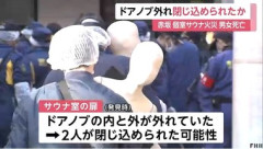1: 名無し 2025/12/16(火) 17:19:35.82 ID:BMjx5znI9 赤坂サウナ店火事 死亡男女は川崎市在住の夫婦 ドアノブ内側も外側も外れ、閉じ込められたか人死亡の個室サウナで非常用ボタン押された形跡…サウナ室ドアノブ脱落し内部閉じ込めの可能性も…