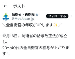 1 : 以下、?ちゃんねるからVIPがお送りします :2025/12/17(水) 08:13:47.717 ID:+3UbeTV70.net防衛省がウキウキでツイートわろた\全自衛官の年収がUPします✨/12月16日、防衛省の給与改正法が成立し、20~40代の全自衛官の給与が上がります!📌20歳で約440万円(+110万円)📌35歳で約600万円(+80万円)📌40歳で約700万円(+80万円)📌生涯収入は約2.9億円に😊これらはいずれも過去最高の金額です💪… pic.twitter.com/nbJJna5y8G— 防衛省・自衛隊 (@ModJapan_jp) December 16, 2025転載元スレッド:…