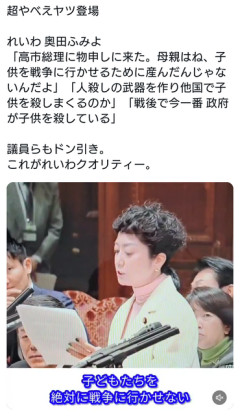 1: シネルギステス(東京都) [JP] 2025/12/16(火) 21:07:44.08 ID:xOlwFM970● BE:662593167-2BP(2000) 2: シネルギステス(東京都) [JP] 2025/12/16(火) 21:09:20.93 ID:xOlwFM970 BE:662593167-2BP(1000) sssp://img.5ch.net/ico/taxi.gif 引用元: ・ スポンサーリンク スポンサーリンク 53: グリコミセス(和歌山県) [DE] 2025/12/16(火) 22:10:06.96 ID:LKnKFY820 >>1 れいわは 今回の中共総領事館のおかげで 悪辣な侵略国家中共ヤクザのチンピラスパイだとモロバレしてしまったからな もう終わりだよ 95: テルモアナエロバクター(千葉県) [US] 2025/12/16(火) 23:38:42.06 ID:kw4lEqsN0 >>1 議員50人削減したら れいわ議員をゼロにできるかな 121: アシドバクテリウム(埼玉県) [US] 2025/12/17(水) 02:13:37.40 ID:smCSwzhA0 >>1 メロリン太郎の演説をAIでオバチャンに変えてるのかと思ったくらい話し方が同じ。 れいわってのはなんか演出家みたいのがいて演技指導しとるのか? 122: クリシオゲネス(庭) [RU] 2025/12/17(水) 02:37:01.06 ID:5oKfHcFx0 >>1 >>2 相変わらず軍国主義の中国やロシアを見ずに ひたすら自国の弱体化を叫ぶのか… それを言って良いのは中国やロシアを止められる奴だけなんだがね… だからいつまで経っても「頭お花畑」とお前らは言われてんのに… 正直こう言う思考停止したいつの時代から来たのか分からん議員いらんよな… 5: マイコプラズマ(みかか) [US] 2025/12/16(火) 21:12:58.98 ID:ExLIdyAa0 >>2 演説のノリが太郎と一緒だな。 台本書いてるのは同じ人なのかな 99: 緑色細菌(大阪府) [MX] 2025/12/16(火) 23:54:47.53 ID:7zmt4f2a0 >>5 台本の審査をする人が同じ人 126: ロドシクルス(やわらか銀行) [US] 2025/12/17(水) 03:43:52.56 ID:+V6TF+Eg0 >>2 片山がだるって感じ聞いてるのが笑えるw 3: ジオビブリオ(茸) [ニダ] 2025/12/16(火) 21:10:20.77 ID:YxhgUyjl0 めっちゃ発狂してるw 4: アクチノポリスポラ(庭) [GB] 2025/12/16(火) 21:12:19.63 ID:BdqPoYq90 質問の時間なのに全く質問せんで演説してたな 7: ニトロソモナス(滋賀県) [ニダ] 2025/12/16(火) 21:14:46.25 ID:GAIFYk6c0 れいわにまともなやついねーのかよw 10: ビフィドバクテリウム(鳥取県) [US] 2025/12/16(火) 21:16:28.78 ID:5pfbqKnA0 >>7 教祖見りゃわかるだろ 17: スファエロバクター(みょ) [ニダ] 2025/12/16(火) 21:23:27.63 ID:At83S9hA0 >>7 石川震災冷やかしに行った時の弁当で特上うな重食うようなやつが党首だぞ 40: グリコミセス(ジパング) [JP] 2025/12/16(火) 21:50:27.34 ID:sQRthBiG0 >>17 石川能登震災は物見遊山 海産物と温泉が楽しみ ちな片山津温泉は男の娯楽や 8: プロカバクター(東京都) [AU] 2025/12/16(火) 21:15:23.83 ID:36sR8ooQ0 国会開くのに1日3億程度と言われてるよね これに何百万ぐらいかかった? 9: カウロバクター(庭) [ES] 2025/12/16(火) 21:15:41.82 ID:GiTAyeM20 気違いにはちゃんと気違いと言える世の中になって欲しい 20: プランクトミセス(茸) [US] 2025/12/16(火) 21:29:40.58 ID:w2NaGS040 「革命に勝利するまで戦う」 集会とデモは、過激派の中核派系とされる「国鉄分割・民営化に反対し、1047名解雇撤回闘争を支援する全国運動」「改憲・戦争阻止!大行進」などが開催を呼びかけた。 実質的な分裂状態にある中核派学生組織「全日本学生自治会総連合」(全学連)の渡辺祥英書記次長は集会で「労働者階級として、帝国主義という敵に対し、全世界から、芝公園に集まっている」と強調。 「高市、トランプ(米大統領)を倒そう。米日の中国侵略戦争を阻止しよう」と訴え、「革命に勝利する日まで戦う」と連帯を呼びかけた。 多数の警察官が警備に当たる中、参加者は全国各地の労働組合の名称が書かれたのぼりや「高市倒せ」「中国侵略戦争阻止!」などのビラを手に、「大軍拡予算を粉砕するぞ」「中国への侵略戦争を阻止するぞ」と声を張って行進した。 32: スフィンゴバクテリウム(やわらか銀行) [US] 2025/12/16(火) 21:37:12.04 ID:GHKSFOv+0 >>20 高市発言より こっちのほうが遥かに物騒 76: アルテロモナス(東京都) [US] 2025/12/16(火) 23:03:56.80 ID:C986DhIf0 >>20 30年前のニュースかなと思って日付見たら先月で恐怖を覚えた 21: レジオネラ(栃木県) [NL] 2025/12/16(火) 21:30:00.38 ID:bBwTxCHP0 こんな健常者と言い難い奴に凄まじい税金使われてるのに納得いくんかね? 140: ヴィクティヴァリス(茸) [US] 2025/12/17(水) 08:49:42.46 ID:qZKi8w8L0 >>21 すでに立憲民主とかいう異常者に相当無駄遣いしてるからな税金を 国民も賢くなってほしいもんだ 24: カルディオバクテリウム(茸) [CN] 2025/12/16(火) 21:32:41.04 ID:Gd41ywF+0 何故中国に言わない? てか誰が戦争するって言ったんだ? 26: フランキア(庭) [FR] 2025/12/16(火) 21:33:56.07 ID:Zon/l3gq0 なんで左の人たちって質問の場ですぐに演説してしまうん? 33: テルムス(東京都) [US] 2025/12/16(火) 21:37:32.38 ID:QyvJVtfp0 太郎が最近出てこないと思ったらファンネル育ててたんか 45: バチルス(奈良県) [US] 2025/12/16(火) 21:54:38.75 ID:P6pW0Rks0 >>33 出てたぞ、これと似たりよったりの難癖質問だったけど 山本太郎「日本人の底力を信じてるとか、ポエムはご勘弁」 高市総理「やめません。誇りに思ってます」 48: テルモミクロビウム(大阪府) [NL] 2025/12/16(火) 22:03:10.06 ID:QUWTH+VT0 >>45 ベクレてるはポエムじゃ済まさんぞ 35: ネン