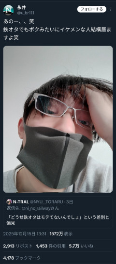 1: 2025/12/17(水) 21:59:11.81 あのー、、笑鉄オタでもボクみたいにイケメンな人結構居ますよ笑 pic.twitter.com/Abb4jGq63h— 永井 (@u_br111) December 15, 2025 ※関連記事 【朗報】鉄オタ「こんなことするなら、二度とペアーズは使いません」…