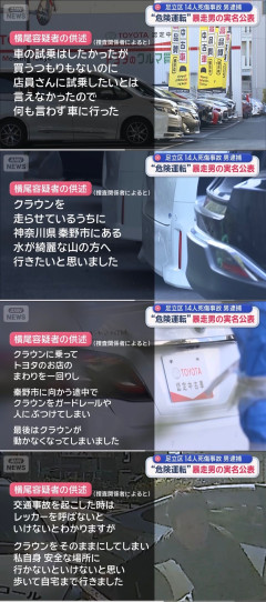 1 : 東京都足立区で盗難車が暴走し14人が死傷した事故で、自動車運転処罰法違反(危険運転致死)容疑などで警視庁に再逮捕された横尾優祐容疑者(37)は、盗んだトヨタ「クラウン」を扱う自動車販売店をこれまでにたびたび訪れていた。 「どうしても乗りたかった」と供述するなど、強い執着がうかがえる。 捜査関係者によると、横尾容疑者は7月、この販売店に初めて来店したとみられる。「車を買いたい。午後にお金を持ってくる」と言い残して立ち去ったが、姿を現さなかった。その際、「試乗をしたい」とも申し出ていたが、同容疑者は約1年前に運転免許証を紛失したといい、免許証を提示できずに断念した。事故の1週間ほど前にも、店の敷地に駐車されていた複数の車に無断で乗り込んでいたという。 事故当日、同容疑者は店を訪れ車に直行。「試乗したいが購入するつもりはなく、店員には言い出せなかった」といい、車のドアが無施錠で、車内にスマートキーがあったため「これでクラウンは自分の車になった」と考えたと説明している。 同容疑者は車を盗んで約2時間走行。埼玉県草加市のガソリンスタンドで車を清掃しており、「憧れのクラウンに乗り、汚れが気になった」とも話しているという。 事故後、同容疑者の自宅からは「クラウン」と書かれたノートや、複数の車のパンフレットなどが押収された。 2 : クラウン!クラウン!クラウン!クラウン! 3 : 走る姿美しい 4 : 罪な車だよクラウン…