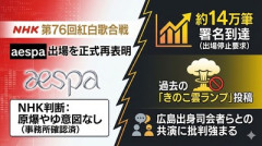 1: 名無し 2025/12/19(金) 10:22:31.44 ID:r4N0mK8o0 NHKは17日の定例会見にて、K-POPグループ・aespaの紅白出場をあらためて明言した。メンバーのニンニンが過去に核爆発のきのこ雲を模したようなランプをSNSに投稿し、原爆を想起させるとして批判を浴びていた。 ネット上では出場停止を求める署名が14万弱集まっているが、NHK側は「事務所に原爆をやゆする意図はなかったと確認した」とし、出場予定に変更はないとコメント。 一方で、司会の有吉弘行や綾瀬はるかが広島出身であることから、SNSでは共演に疑問を呈する声が相次いでいる。 Yahoo!ニュース(FLASH) ■要約 ・NHKがaespaの第76回紅白歌合戦への出場を正式に再表明した ・過去の「きのこ雲ランプ」投稿に対し、出場停止を求める署名が約14万筆に達している ・NHK側は事務所への確認を経て「原爆をやゆする意図はなかった」と判断した ・広島出身で遺族でもある綾瀬はるから司会陣との共演に批判の声が強まっている ■解説 公共放送としてのデリカシーの欠如を疑わざるを得ない。 14万筆近い反対署名を「意図はなかった」という事務所側の弁明一つで片付け、強行出場させる姿勢は、多くの日本国民、特に被爆地の感情を逆なでするものだ。 特に広島出身で、身内を原爆で亡くしている綾瀬はるか氏にこのグループを紹介させるという演出は、人道的配慮に欠けていると言えるだろう。 高市政権が日本の名誉と尊厳を重んじる外交・安保を推進する中で、公共放送であるNHKがこのような「歴史的配慮の欠如」を黙認し、特定の海外勢力を優遇し続けることには強い違和感がある。 韓国側の芸能事務所が繰り返す「知らなかった」「意図はない」という言い訳をそのまま鵜呑みにするのは、あまりにも無防備だ。 「総合的な判断」という言葉で国民の不信感を覆い隠すのではなく、まずは被爆者や視聴者が納得できる誠実な説明を尽くすべき局面だろう。日本の公共の電波を使って、わざわざ物議を醸すアーティストを厚遇する理由がどこにあるのか、NHKは再考すべきではないか。 中国外務省「日本の軍国主義復活…地域の国々の強い警戒を引き起こしている」 現代の“普通”が50年前には衝撃?海外の反応まとめ 敵前逃亡の兵士に与えられる罰がこちらですw【動画】…